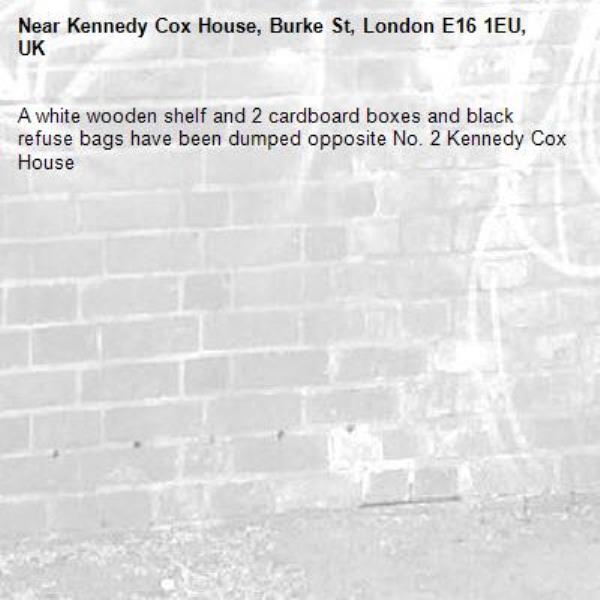A white wooden shelf and 2 cardboard boxes and black refuse bags have been dumped opposite No. 2 Kennedy Cox House