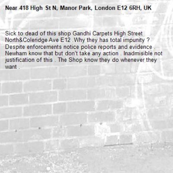 Sick to dead of this shop Gandhi Carpets High Street North&Coleridge Ave E12 .Why they has total impunity ? Despite enforcements notice police reports and evidence . Newham know that but don’t take any action . Inadmisible not justification of this . The Shop know they do whenever they want .