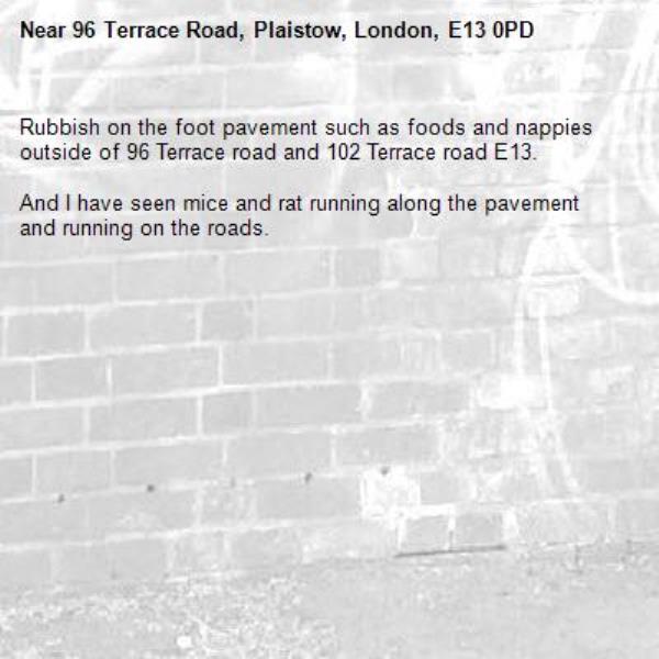 Rubbish on the foot pavement such as foods and nappies outside of 96 Terrace road and 102 Terrace road E13.
