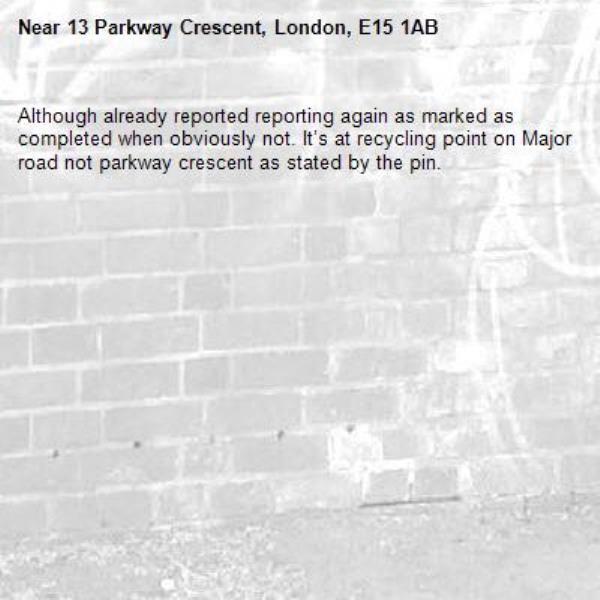 Although already reported reporting again as marked as completed when obviously not. It’s at recycling point on Major road not parkway crescent as stated by the pin.