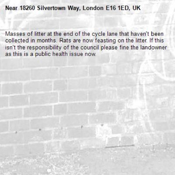 Masses of litter at the end of the cycle lane that haven't been collected in months. Rats are now feasting on the litter. If this isn't the responsibility of the council please fine the landowner as this is a public health issue now.