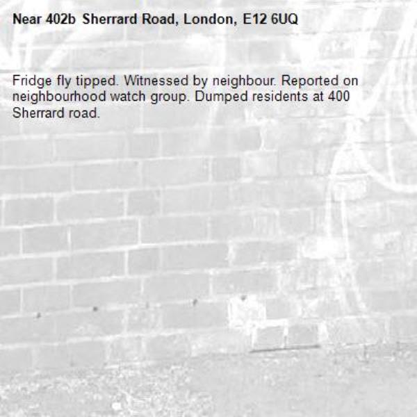 Fridge fly tipped. Witnessed by neighbour. Reported on neighbourhood watch group. Dumped residents at 400 Sherrard road.