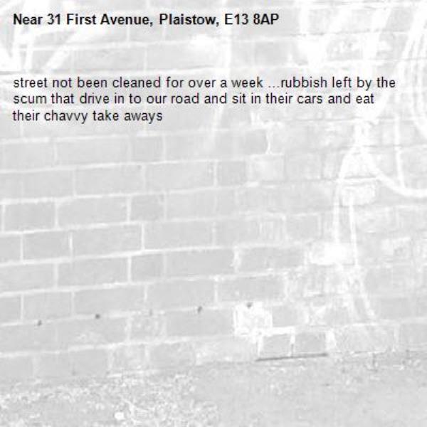 street not been cleaned for over a week ...rubbish left by the scum that drive in to our road and sit in their cars and eat their chavvy take aways