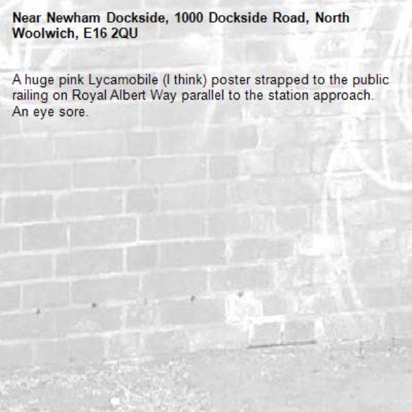A huge pink Lycamobile (I think) poster strapped to the public railing on Royal Albert Way parallel to the station approach. An eye sore.