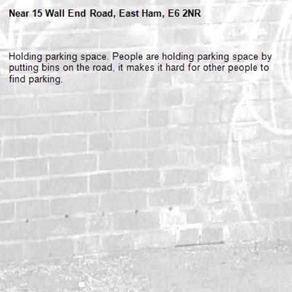 Holding parking space. People are holding parking space by putting bins on the road, it makes it hard for other people to find parking.